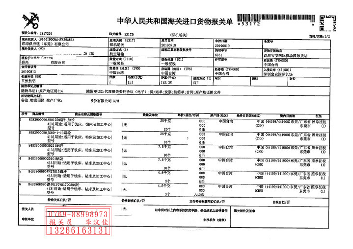 三,臺灣蝸輪蝸桿空運進口清關文件: