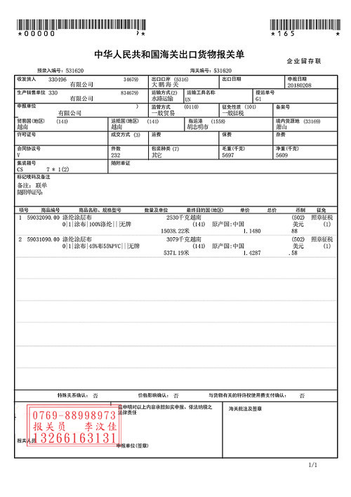 滌淪涂層布料出口報(bào)關(guān)單