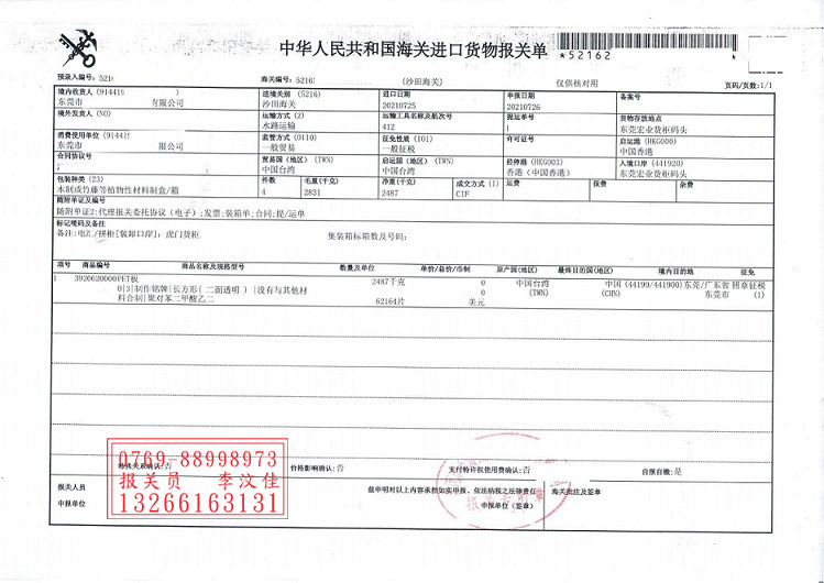 前面小編一直在講東莞沙田港進口清關(guān),今天聚海小編特別針對東莞太平宏業(yè)碼頭清關(guān)為各位小伙伴做分享,產(chǎn)品就以臺灣PET板為例,通過海運直航運輸方式,持ECFA產(chǎn)證做免關(guān)稅報關(guān).