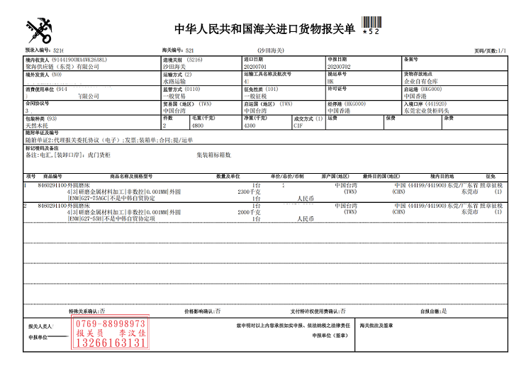 慶幸公司同事機(jī)緣巧合剛剛兩臺(tái)臺(tái)灣產(chǎn)外圓磨床,因?yàn)槭肇泦挝粸闁|莞清溪一臺(tái)資企業(yè),所以清關(guān)口岸選擇的是東莞虎門(mén)宏業(yè)碼頭,該企業(yè)剛剛注冊(cè)成立,人手也不夠,且對(duì)虎門(mén)港進(jìn)口清關(guān)手續(xù)也不是特別了解,一來(lái)二去多次溝通后,最終確認(rèn)臺(tái)灣工廠交貨即EX-WORK的成交方式,由小編公司全程操作整套物流及清關(guān).這不剛剛拿到進(jìn)口報(bào)關(guān)單,小編就迫不及待的把整個(gè)操作流程整理出來(lái),希望能帶給更多小伙伴技術(shù)指導(dǎo).
