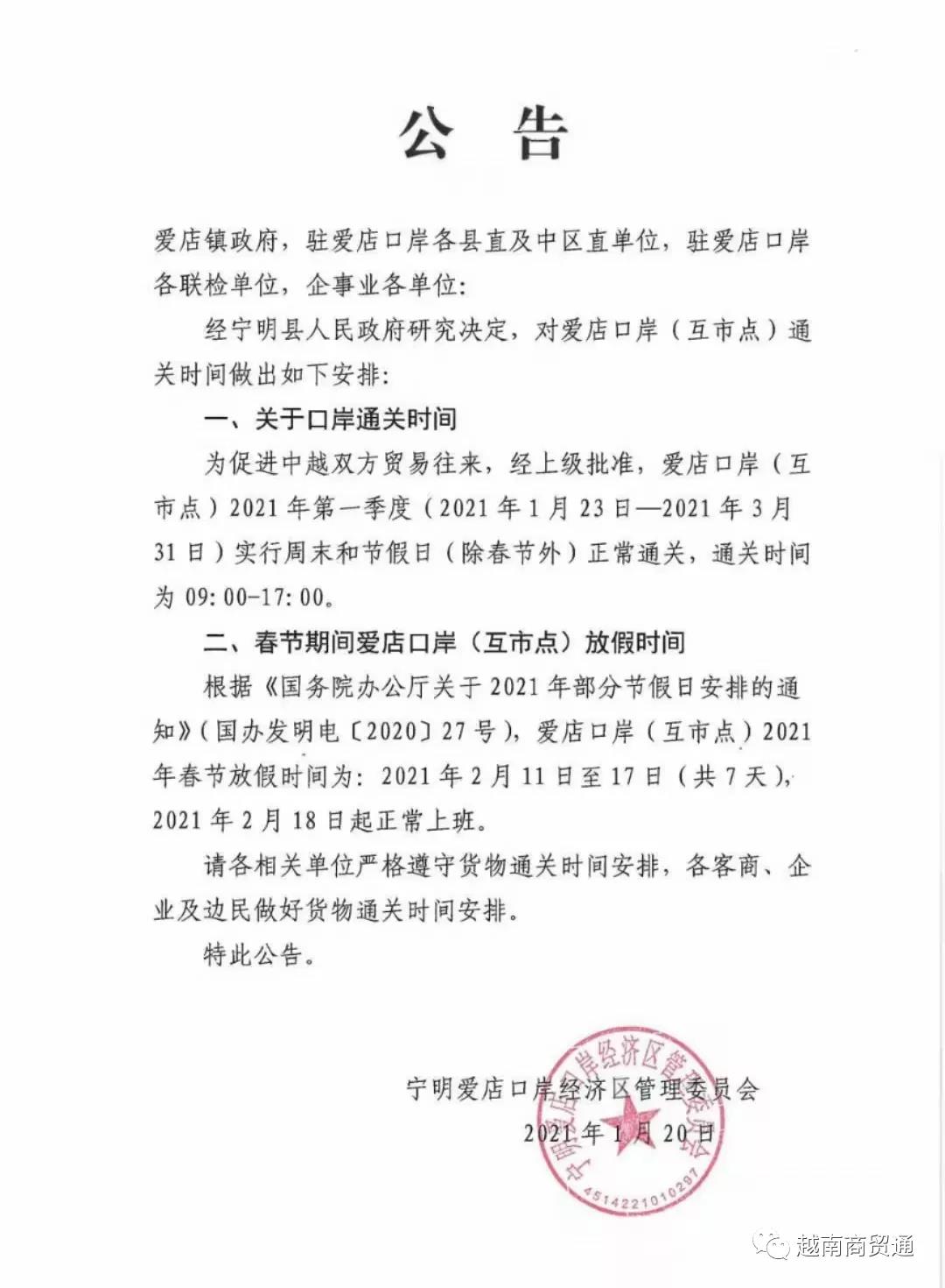 2021年開放中越互市口岸--愛店口岸通關(guān)時間